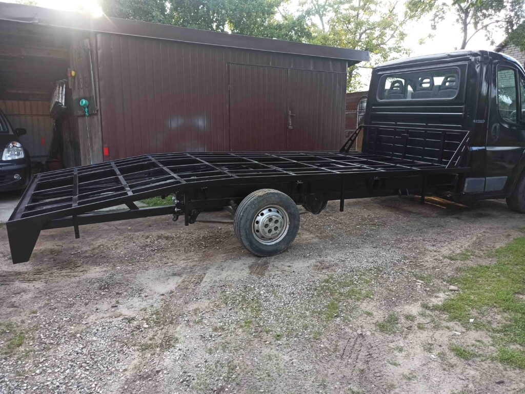 Po wykonaniu konstrukcji zająłem się montażem wszystkich elementów dodatkowych, aby laweta była w pełni gotowa do pracy. Dzięki dokładności i odpowiednio dobranym materiałom całość uzyskała wysoką odporność na obciążenia, jakie towarzyszą codziennej pracy w transporcie pojazdów. Efektem jest zabudowa lawety w pełni przygotowana do intensywnej eksploatacji, zapewniająca bezpieczeństwo i wygodę użytkownika.
